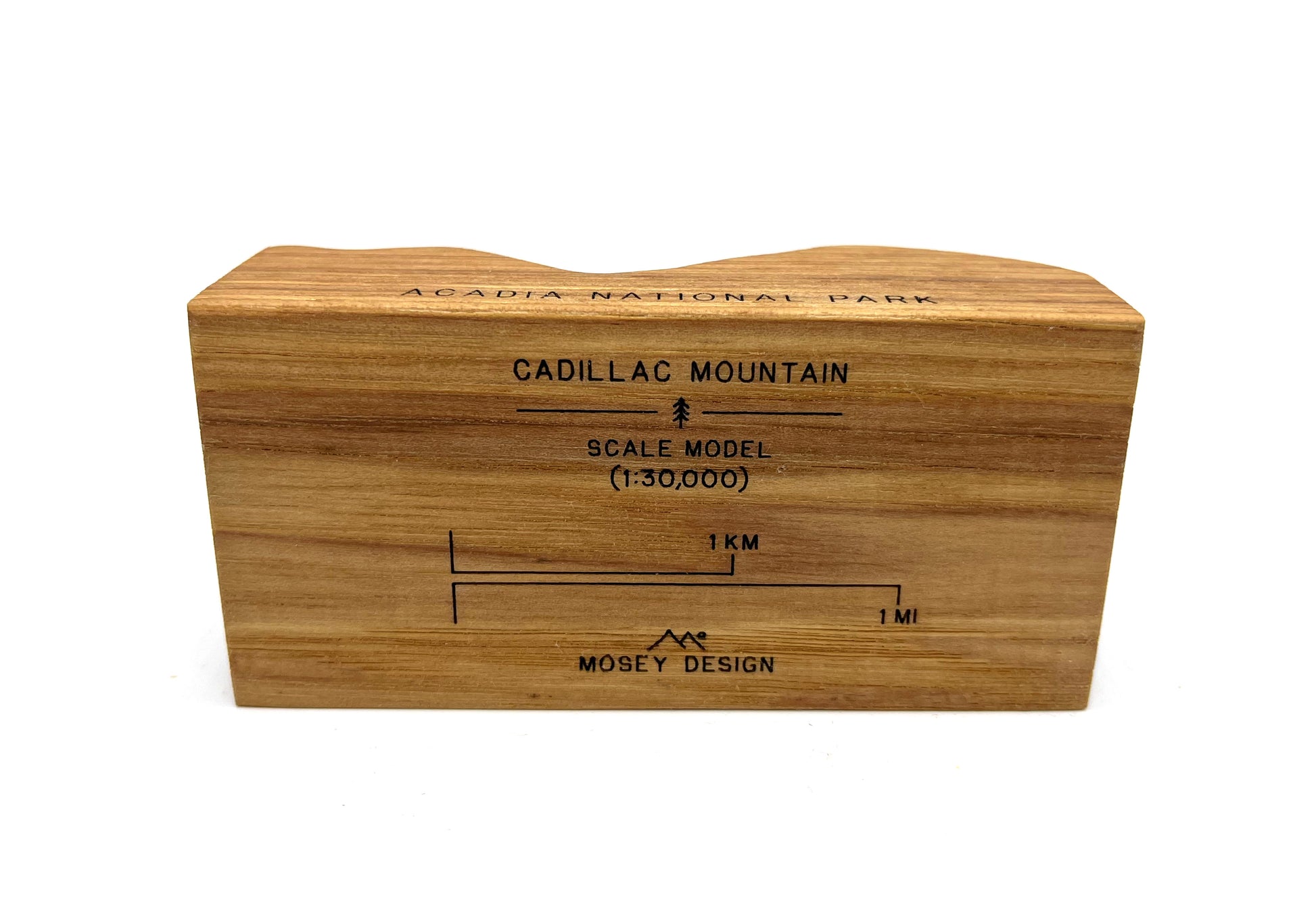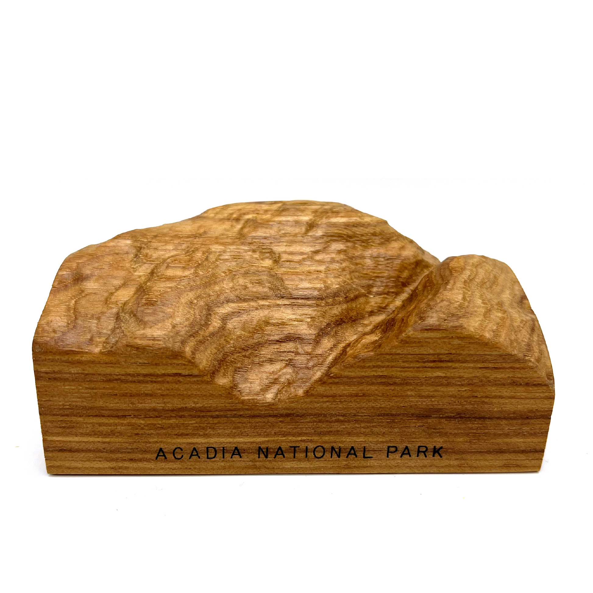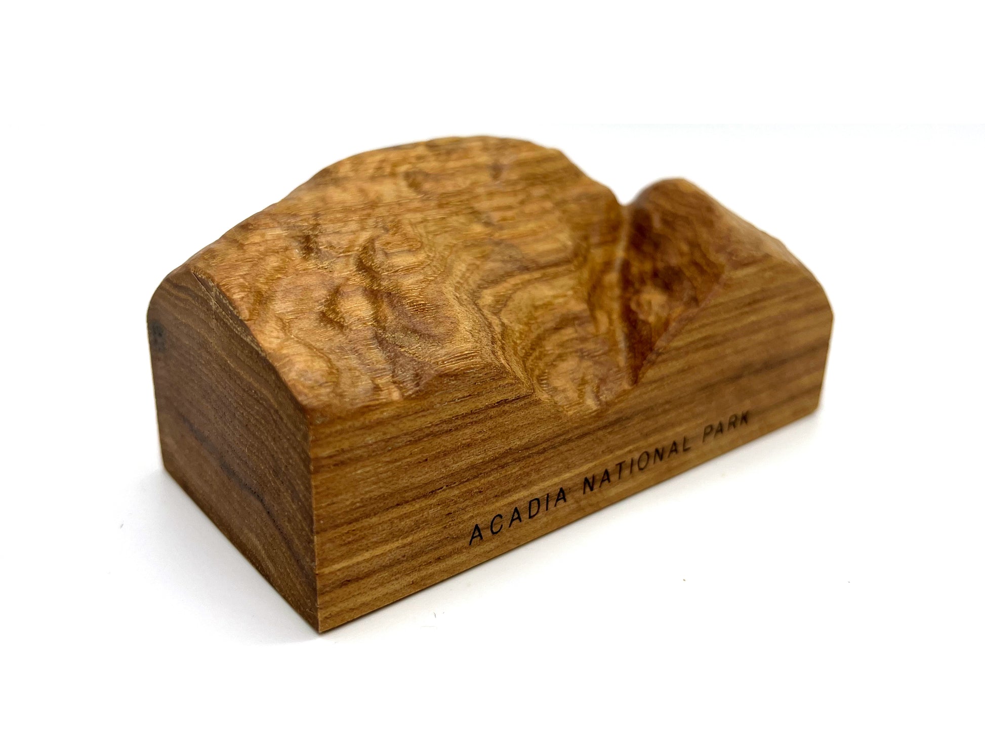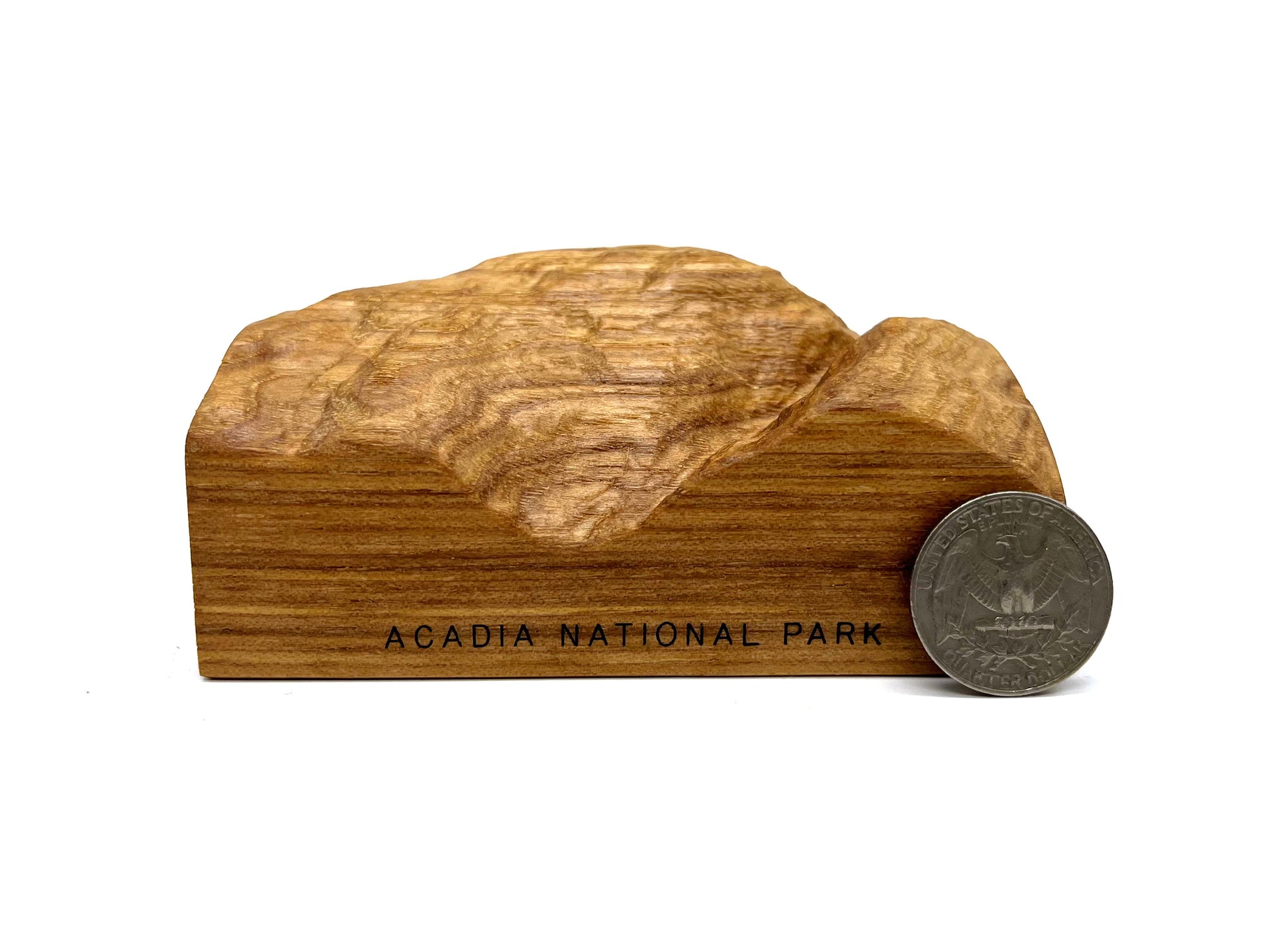 Solid wood topographical carving of Acadia National Park, featuring Cadillac Mountain. Carved from a solid block of hickory wood, our models have a solid feel. Each model is designed using actual satellite topographic data to recreate the feeling of awe experienced while being in the presence of one of our national treasures.