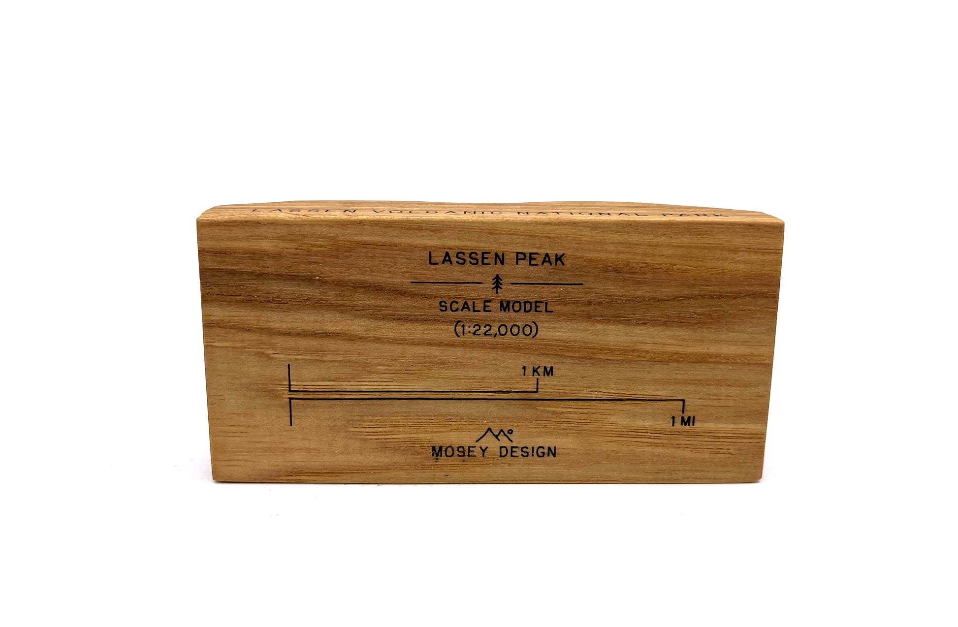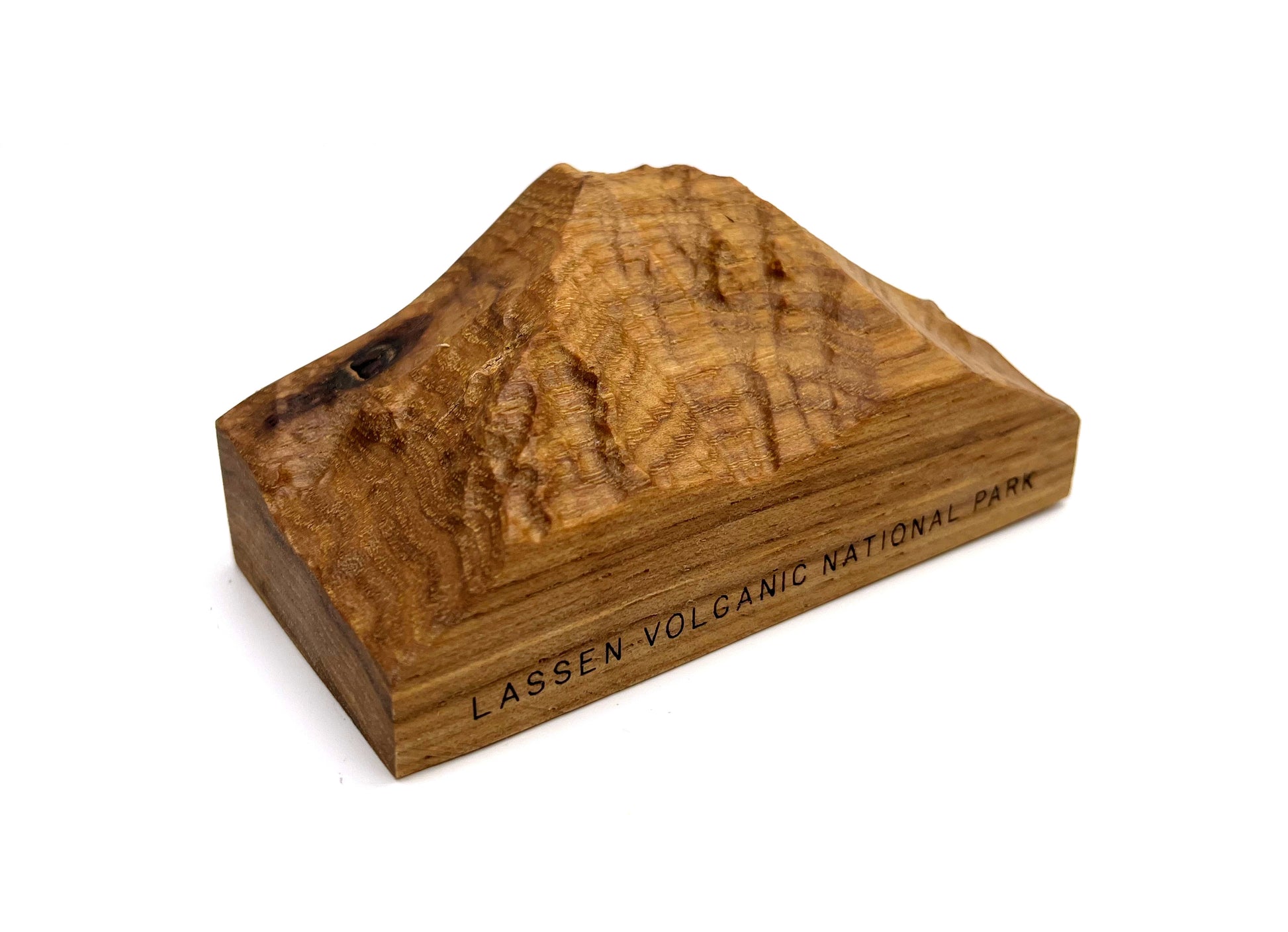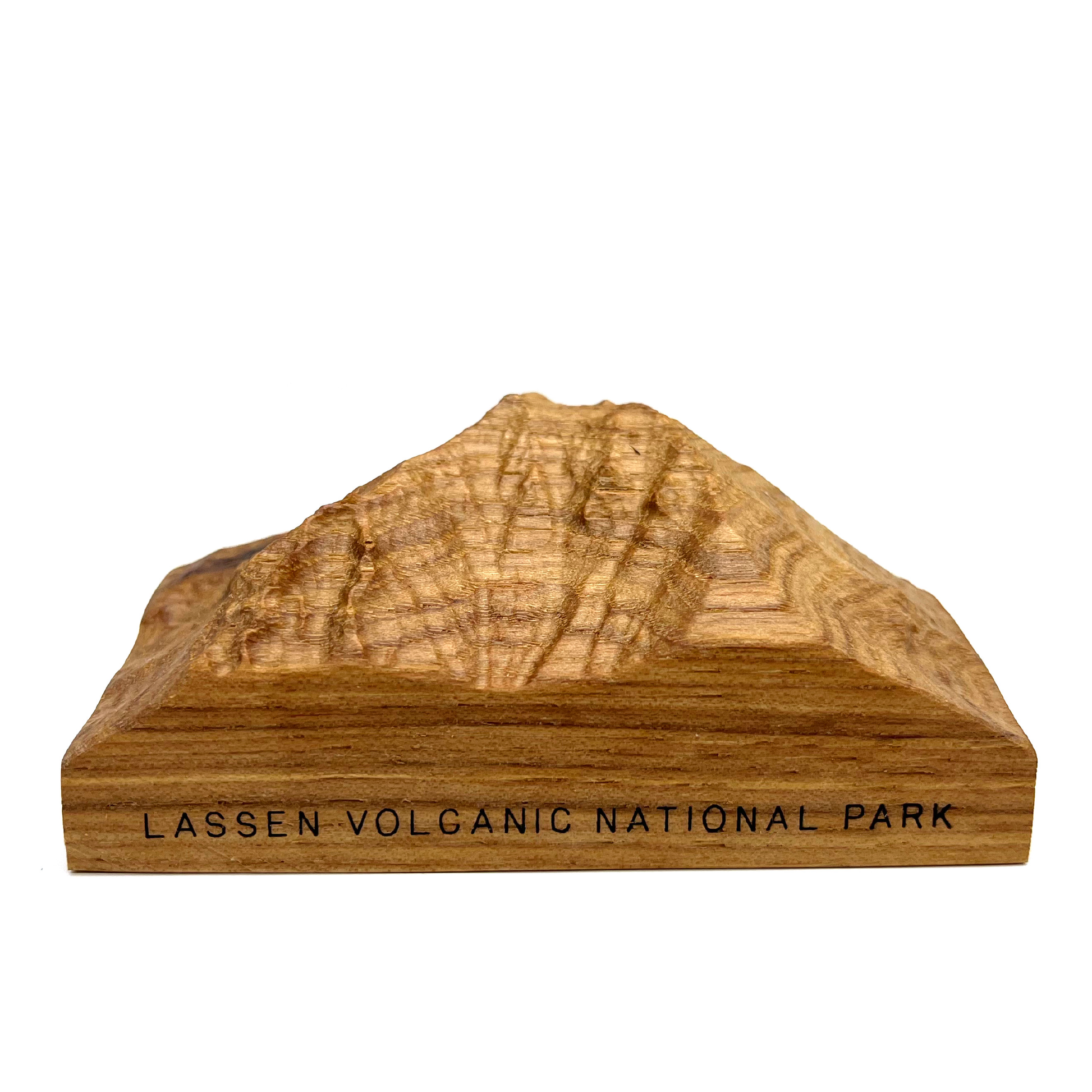 Solid wood topographical carving of Lassen Volcanic National Park, featuring Lassen Peak. Carved from a solid block of hickory wood, our models have a solid feel. Each model is designed using actual satellite topographic data to recreate the feeling of awe experienced while being in the presence of one of our national treasures.