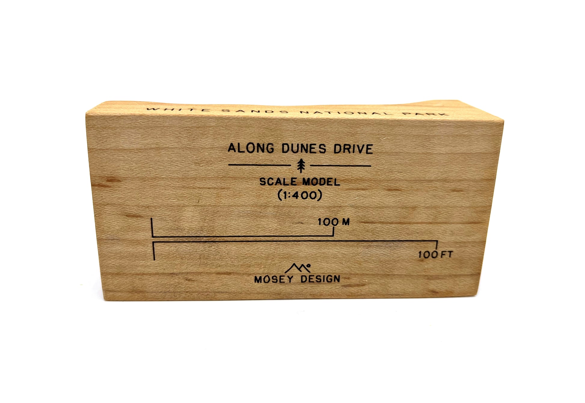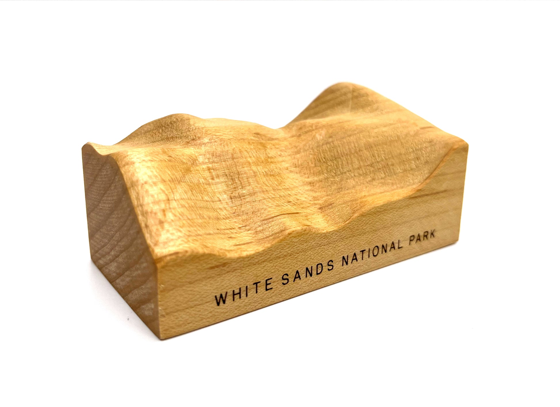Solid wood topographical carving of White Sands National Park, featuring dunes along Dune Drive. Carved from a solid block of hickory wood, our models have a solid feel. Each model is designed using actual satellite topographic data to recreate the feeling of awe experienced while being in the presence of one of our national treasures.